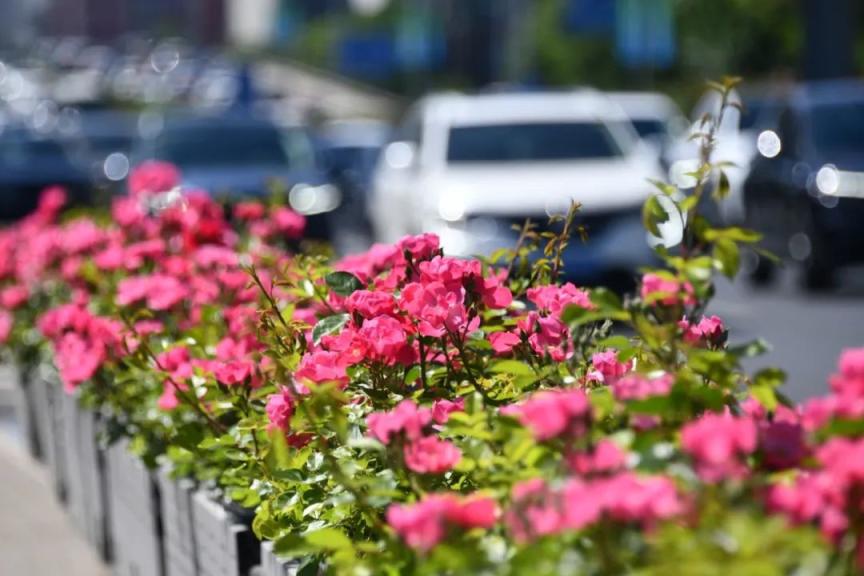 路过国贸桥区,东西南北四向主干道双向左转、右转匝道桥体护栏上均悬挂着栽植长方形花箱,粉色月季在微风中摇曳生姿,沿路望去景不断线,俯瞰就仿佛一个流动的“空中花廊”。市民纷纷点赞说,“通勤路成为观景长廊。”